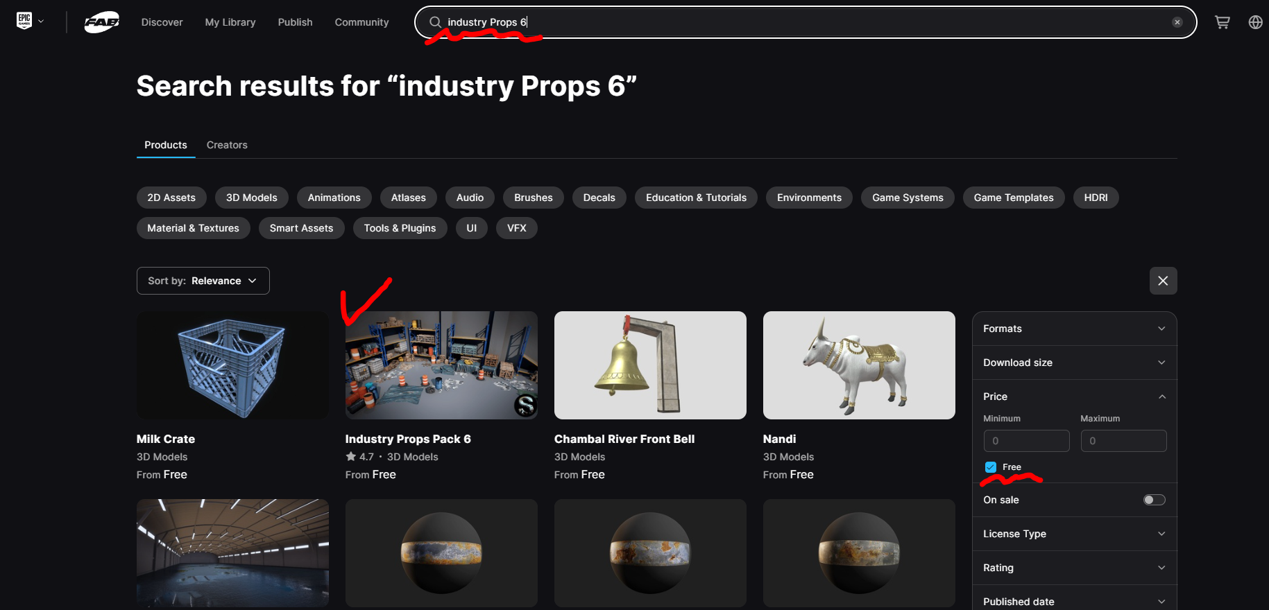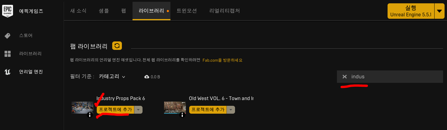 Fab에서 industry Props 6을 검색하고 에셋을 라이브러리에 받아둡니다.