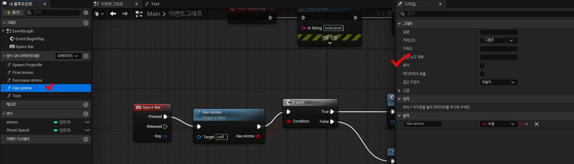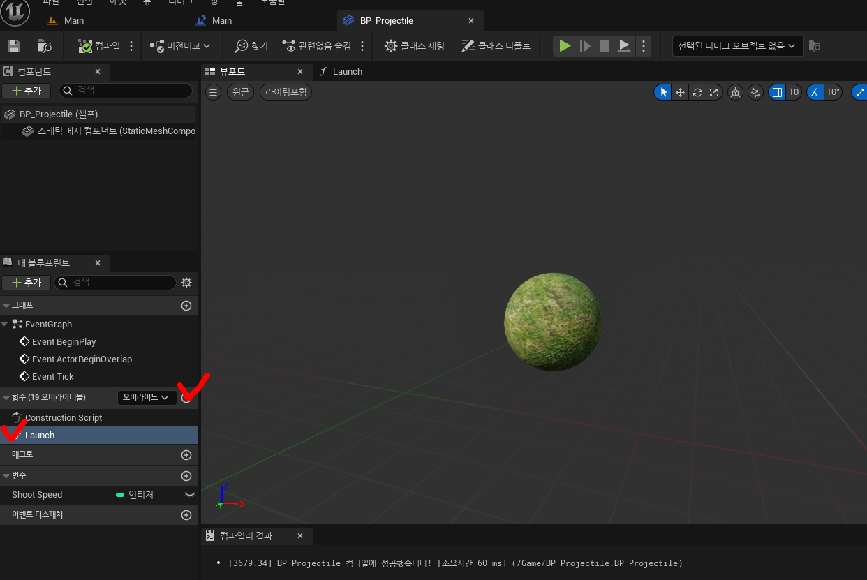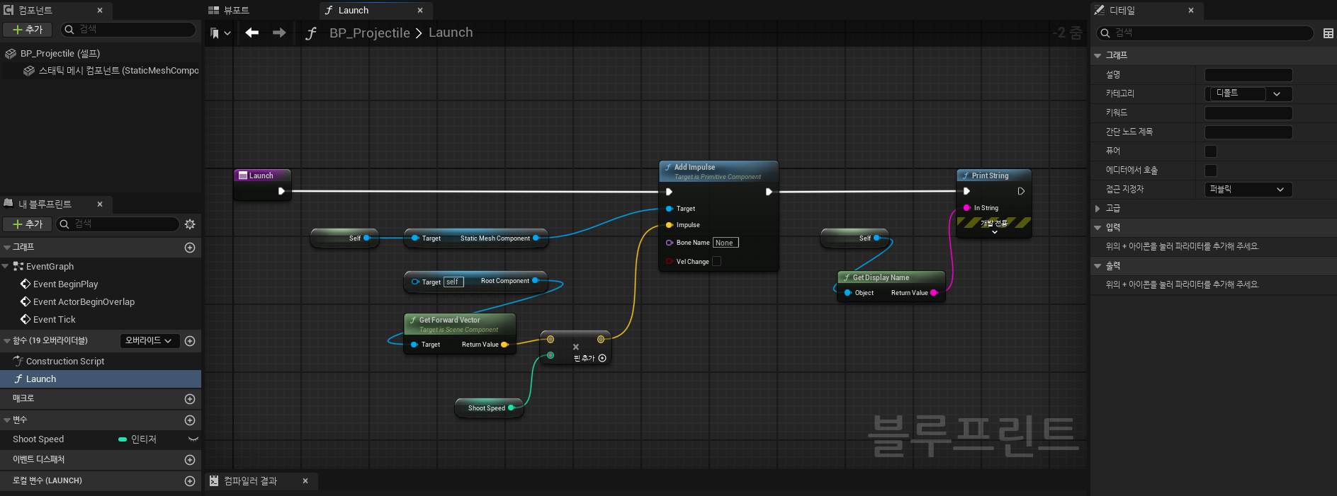 레벨블루프린트에서 생성한 발사체에 힘을 가하는 부분을 발사체 클래스 내부로 옮겨서 멤버함수로 만들어보겠습니다.