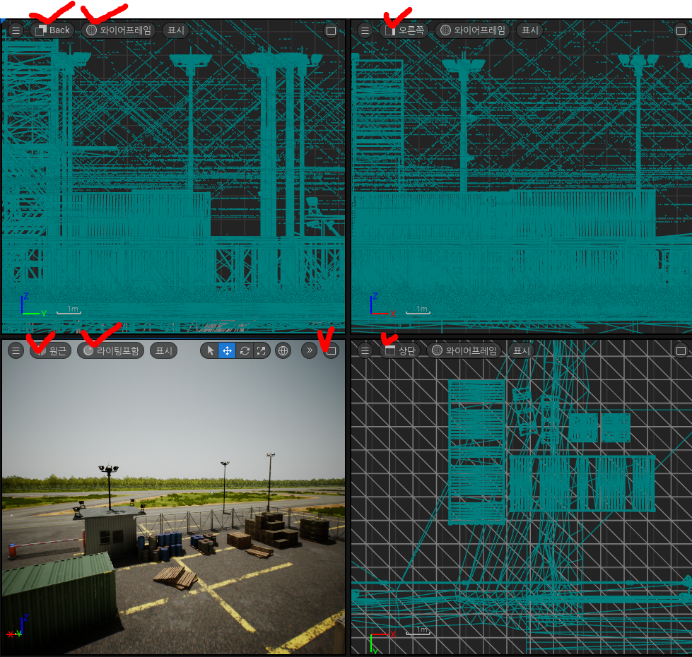 뷰포트 아이콘 : 뷰포트를 4개로 분할하여 여러 각도에서 보게 하거나 1개로 확대하여 레벨을 자세히 탐색할 수 있다.
