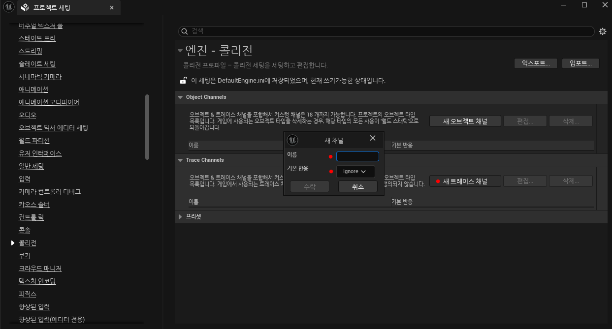 에디터 우측 상단의 세팅 > 프로젝트 세팅 > 엔진 > 콜리전