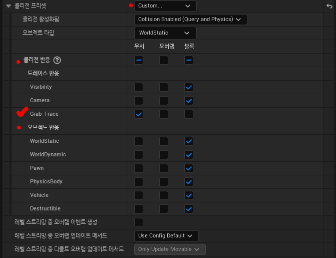 Custom을 선택하면 아래로 콜리전 반응, 트레이스 반응 등을 설정할 수 있도록 레이어가 추가됩니다.