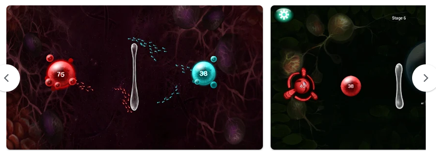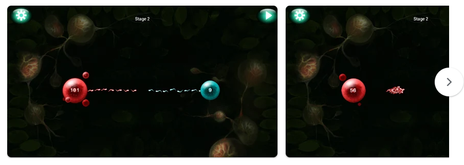 룰: 스테이지에선 내 행성과 두 행성이 있다. 행성에 써 있는 숫자가 인구 수이고 매초 늘어난다. 두 행성을 드래그로 연결하면 내 행성끼린 시작점에서 끝점으로 인구를 보내고, 적 행성과 연결하면 나만 보낼 수도 있고, 적도 보내는 경우 중간에서 만나서 인구가 사라진다. 결국 한 쪽의 인구가 0이되서 다른 한쪽의 행성에 인구가 도달하면 행성을 점령 할 수 있다. 스테이지마다 내 행성과 적 행성의 상태가 다르며, 행성 간 거리나 인구수를 고려해서 모든 행성을 점령하면 된다.