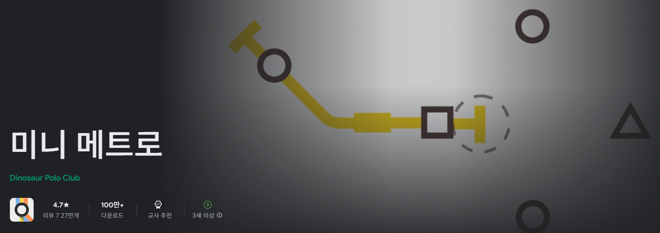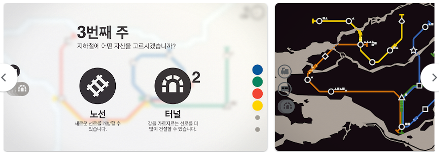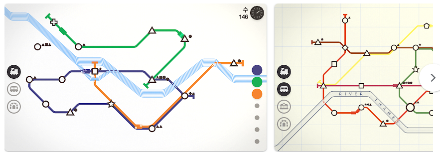 룰: 도형 모양의 역이 있고, 승객들도 도형모양으로 역 옆에 작게 계속 생겨난다. 역을 드래그해서 노선을 만들면 지하철도 자동으로 생겨서 왕복운동을 하는데, 지하철이 오면 승객들이 알아서 지하철을 타고 자신의 모양의 역에서 내리고 사라진다. 역에 너무 많은 승객이 대기중이면 탈락이고 점차 빈공간에서 역이 생겨는 것에 맞춰 노선을 완성해가는 게임이다.