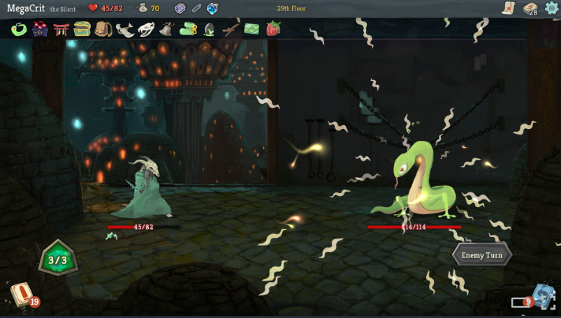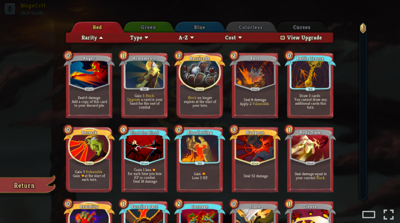 룰: 캐릭터를 고르고 컨셉에 맞는 기본 덱을 받는다. 최종보스에게 가는 길에서 몬스터, 중간보스, 상점 등의 경로를 선택해 나아간다. 전투는 턴제 카드게임으로, 내 턴엔 뽑은 카드들 중 마나에 맞게 사용할 수 있고, 덱에서 모두 뽑아쓰면 사용한 카드더미가 덱으로 돌아간다. 이 순환구조를 이용하는게 핵심이다. 처음 덱은 기본덱이라 특색이 없고 진행하며 얻은 카드를 추가하거나 덱에서 카드를 삭제하며 덱구성을 할 수 있다. 보스급 몬스터는 강하지만 처치하면 영구 지속효과가 있는 유물을 줘서 최종보스 클리어를 위해 덱과 유물을 완성해야한다.