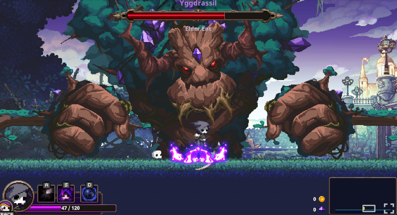 룰: 2D 로그라이크 액션 플랫포머 게임. 기본 머리 해골로 시작해서 플레이 중 얻는 다양한 해골로 머리를 교체 가능하고 교체하면 능력을 얻음. 마을에선 모은 골드로 아이템과 해골 구매도 가능하고 아이템과 해골의 시너지가 중요함.