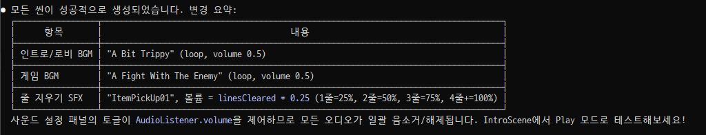 - 테트리스 블록 한 줄 완성 효과음과 씬 별로 BGM 추가