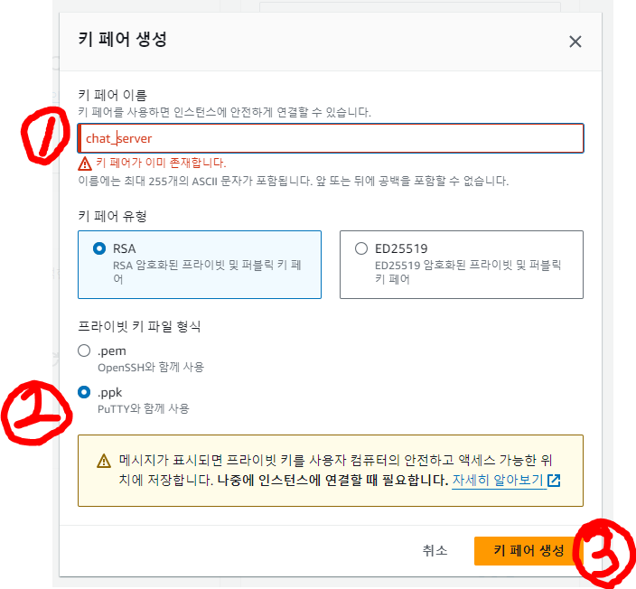 3. 키 페어 생성 순서로 진행합니다