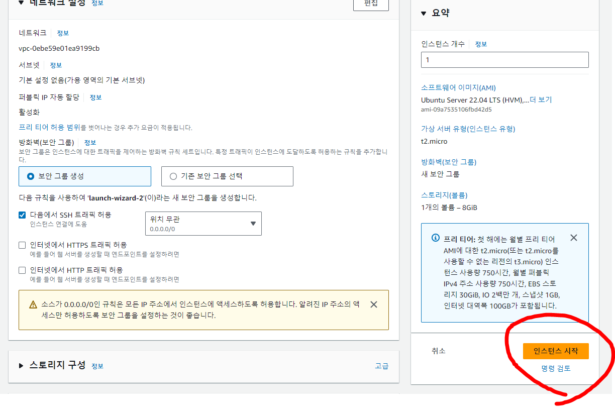 위 과정을 따라왔다면 인스턴스 시작을 눌러줍니다.