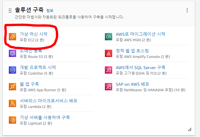 콘솔창을 내리다보면 솔루션 구축이 있는데, 거기서 가상 머신 시작 클릭!