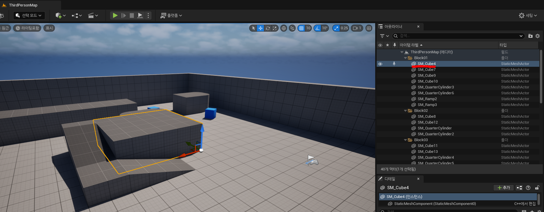 액터를 클릭하면 아웃라이너 탭에서 해당 액터가 포인트 된다.